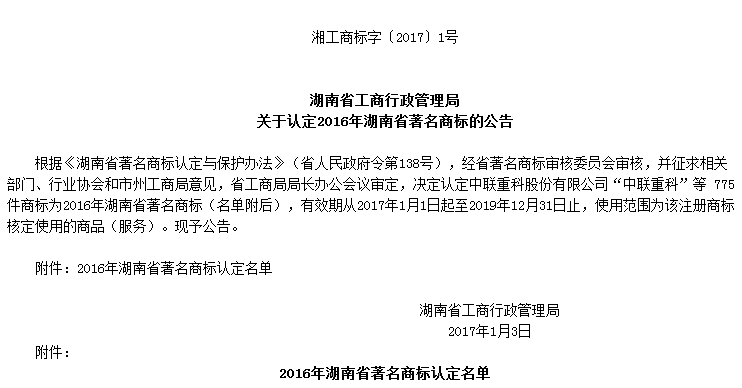 關于認定2016年湖南省著名商標的公告