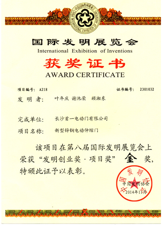 長沙首一電動(dòng)門有限公司獲我省企業(yè)類項(xiàng)目金獎(jiǎng)